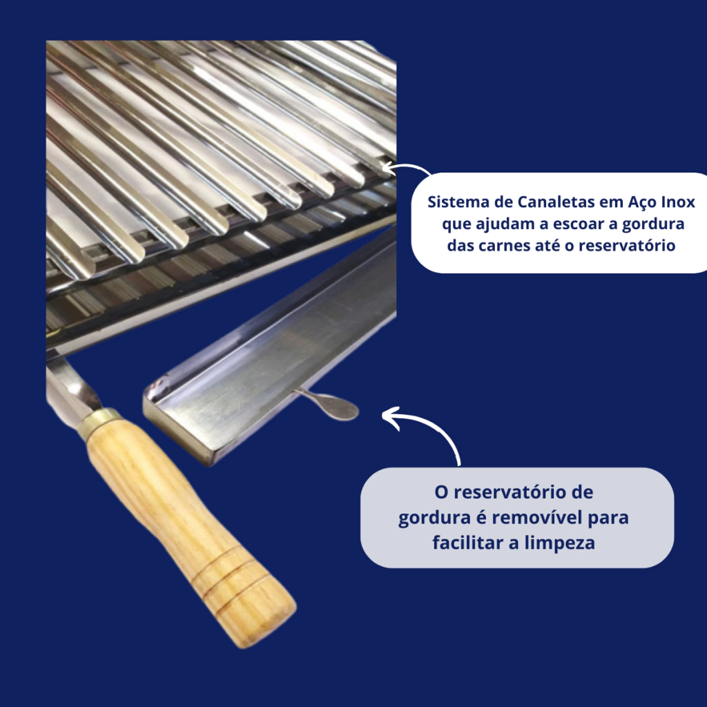 Possui sistema de canaletas que ajudam a escoar a gordura das carnes até o reservatório evitando o excesso de fumaça e a formação de labaredas, evitando que a carne fique chamuscada.