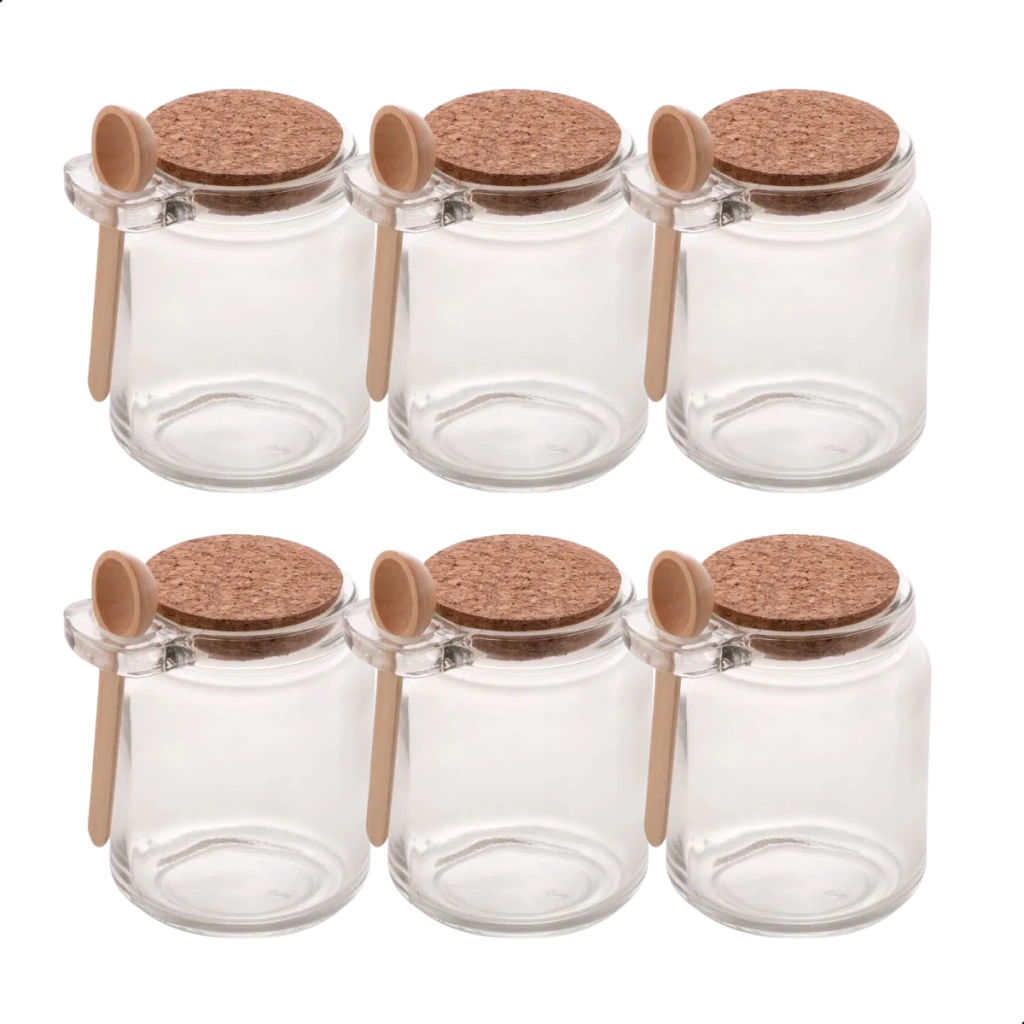 Kit 6 Mini Potes de Vidro 250ml Com Colher de Bambu e Tampa Cortiça