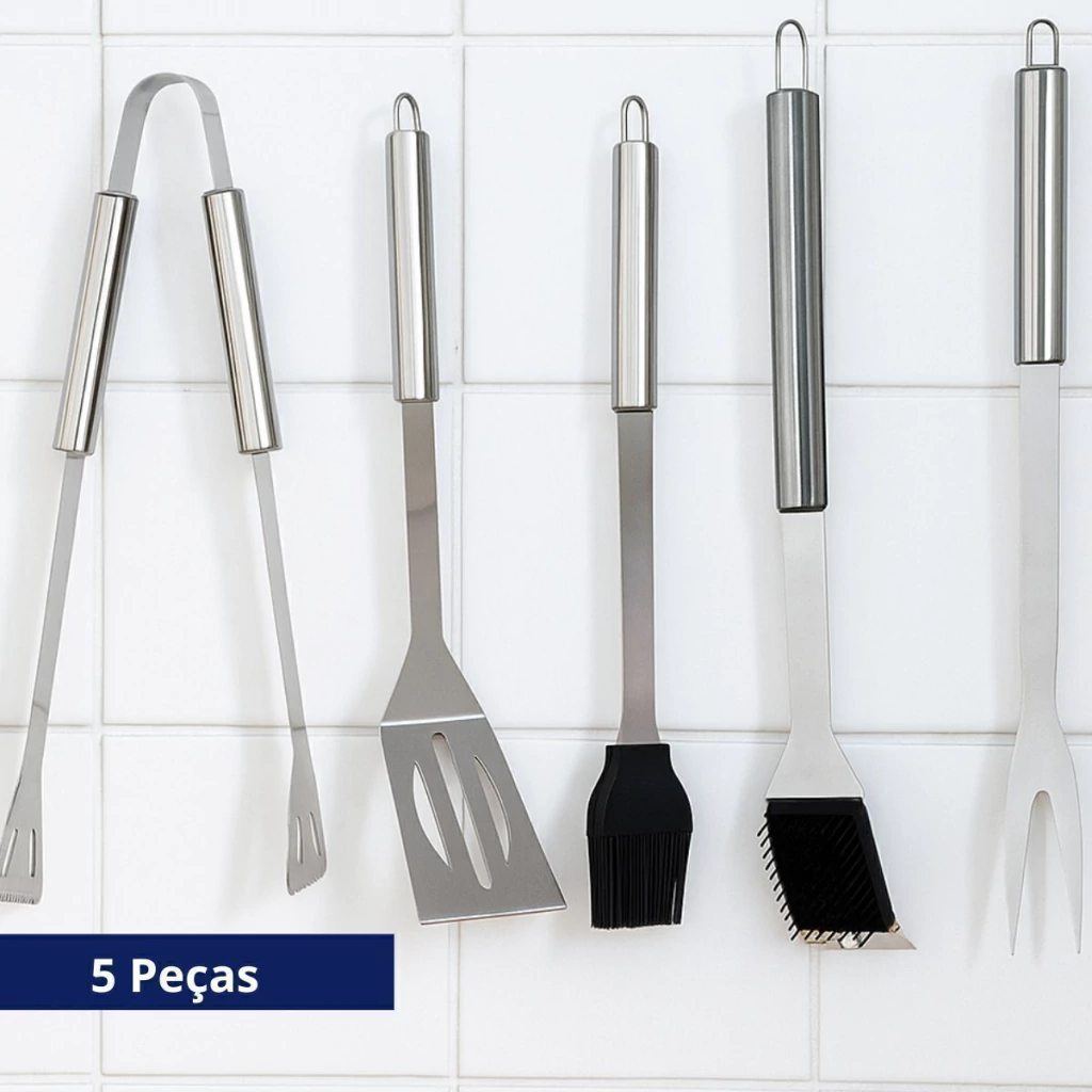 Torne seu churrasco ainda mais prático e completo com o Kit Churrasco 5 Peças em Aço Inox!